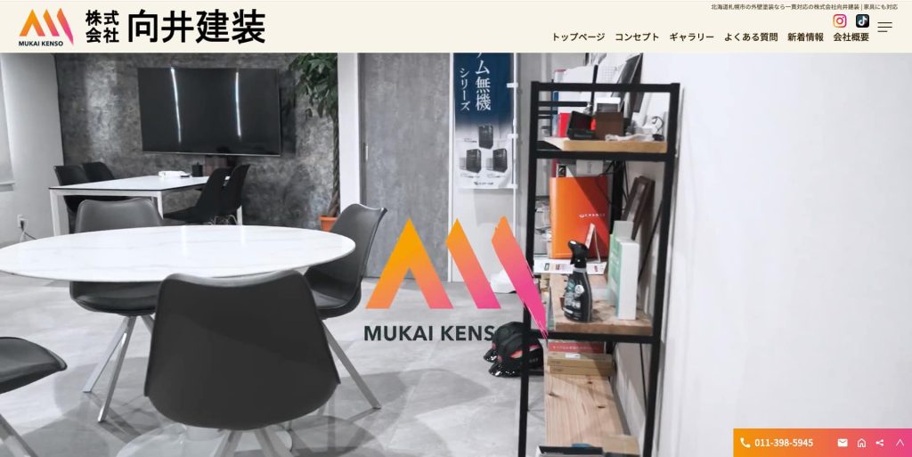 株式会社向井建装は、北海道札幌市に拠点を置く外壁塗装専門会社で、外壁や屋根、防水工事、家具塗装まで幅広く対応しています。専門スタッフによる外壁診断やカラーシミュレーションを実施し、施工内容や検査結果を写真付きの完了報告書で説明するなど、顧客との打ち合わせを重視しています。