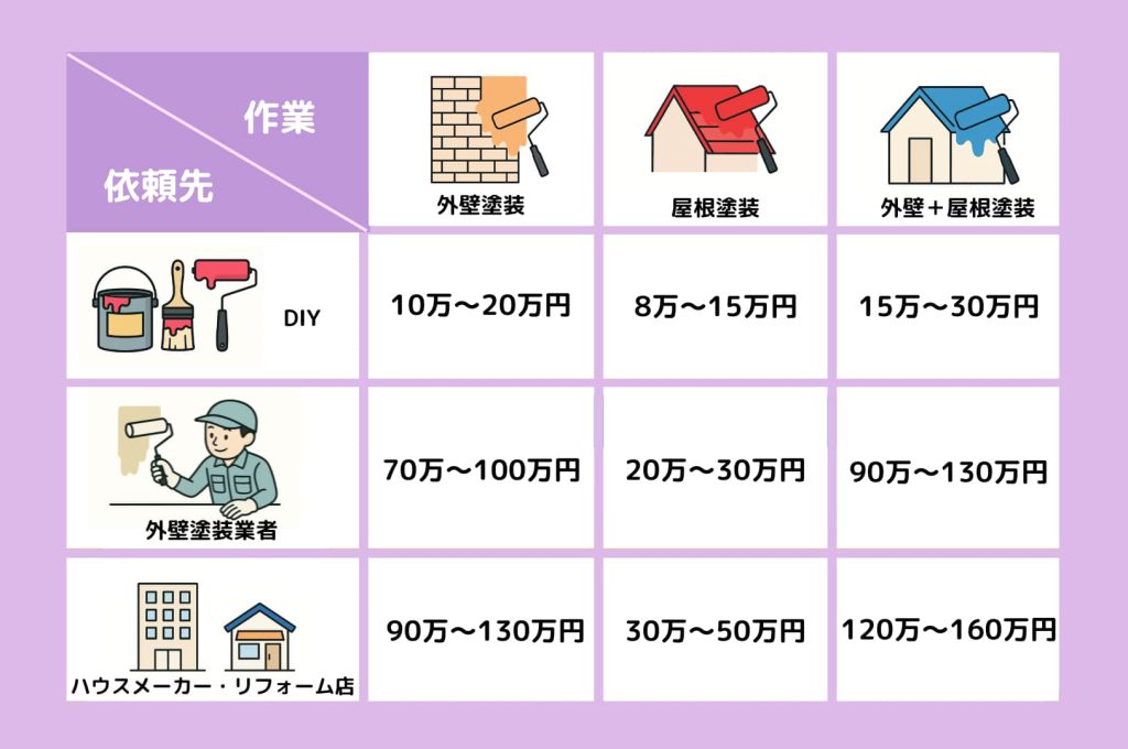 外壁塗装の費用は、依頼先や面積、塗料で大きく変わります。ここでは「DIY」「外壁塗装業者」「ハウスメーカー・大手リフォーム会社」の相場と特徴を比較してみましょう。