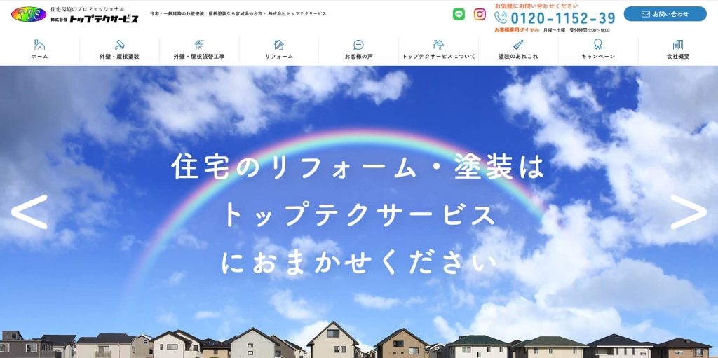 「トップテクサービス」は、宮城県仙台市を拠点に外壁塗装・屋根塗装を中心とした住宅リフォームを手がける企業です。創業以来、地域密着型のサービスを大切にし、お客様一人ひとりの住まいに合わせた塗装プランを提案しています。