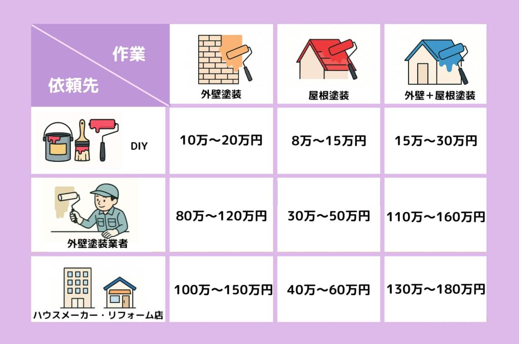 外壁塗装の費用は、依頼先や面積、塗料で大きく変わります。ここでは「DIY」「外壁塗装業者」「ハウスメーカー・大手リフォーム会社」の相場と特徴を比較してみましょう。