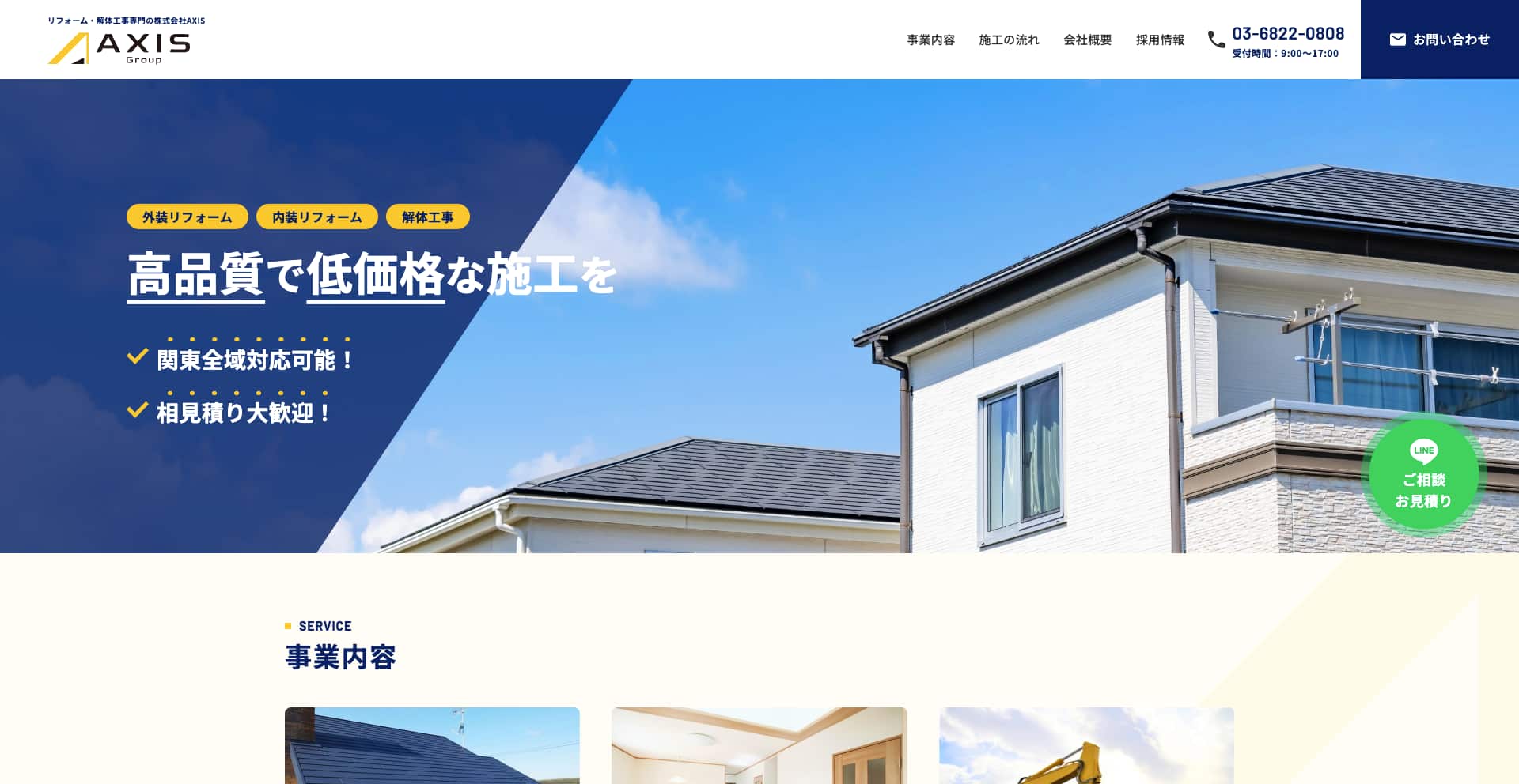 株式会社AXISは、外装リフォームを得意分野とする総合リフォーム業者です。外壁や屋根の補修・塗装、防水施工、耐震補強など、建物の外観と構造を長持ちさせるリフォームに対応しています。顧客目線を重視し、高品質な施工を適正価格で提供することを使命としています。