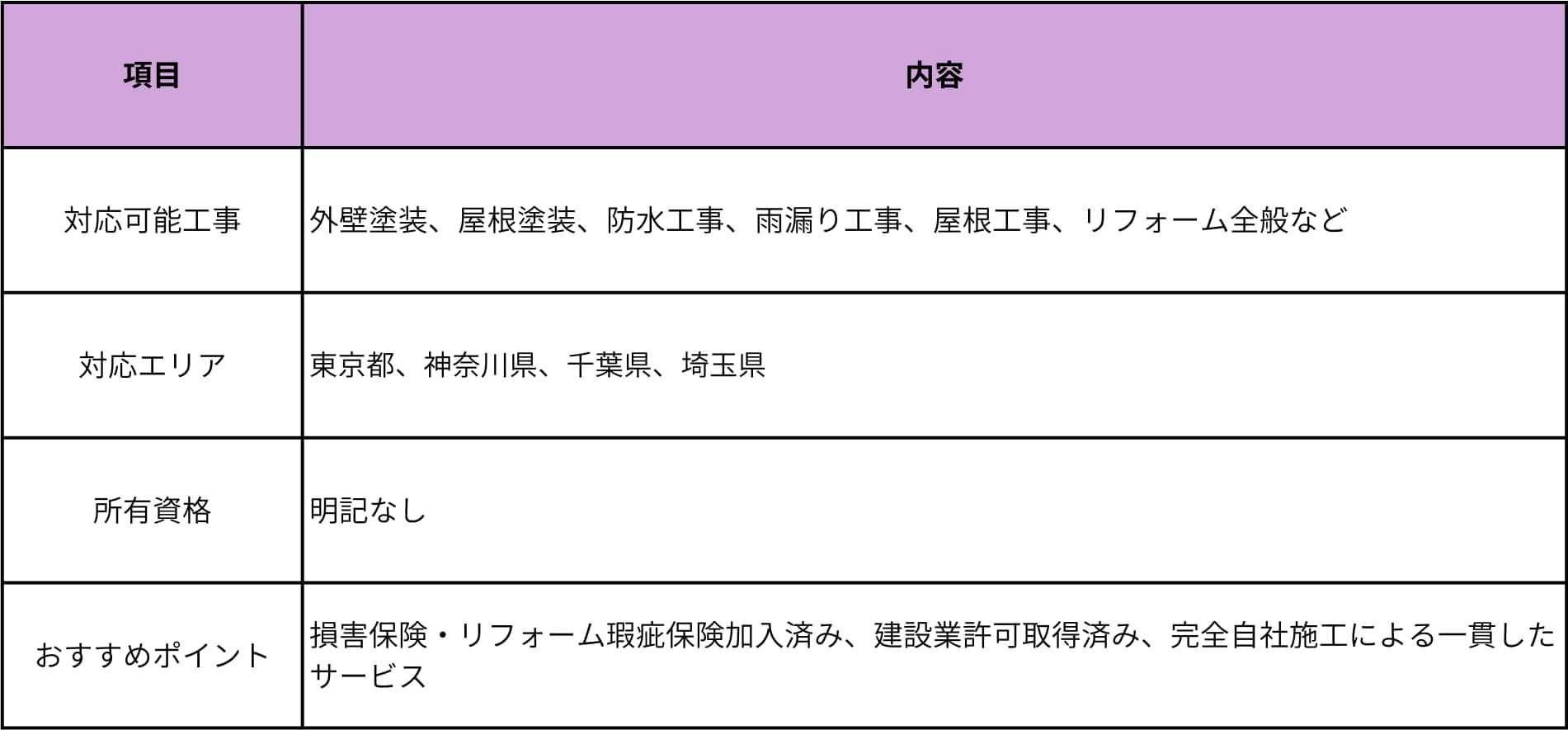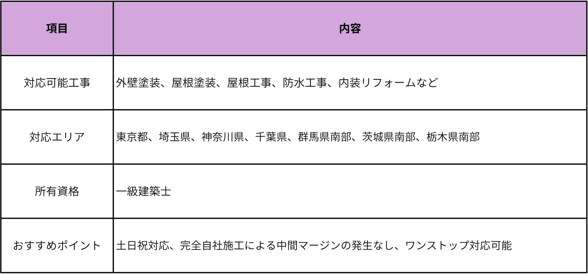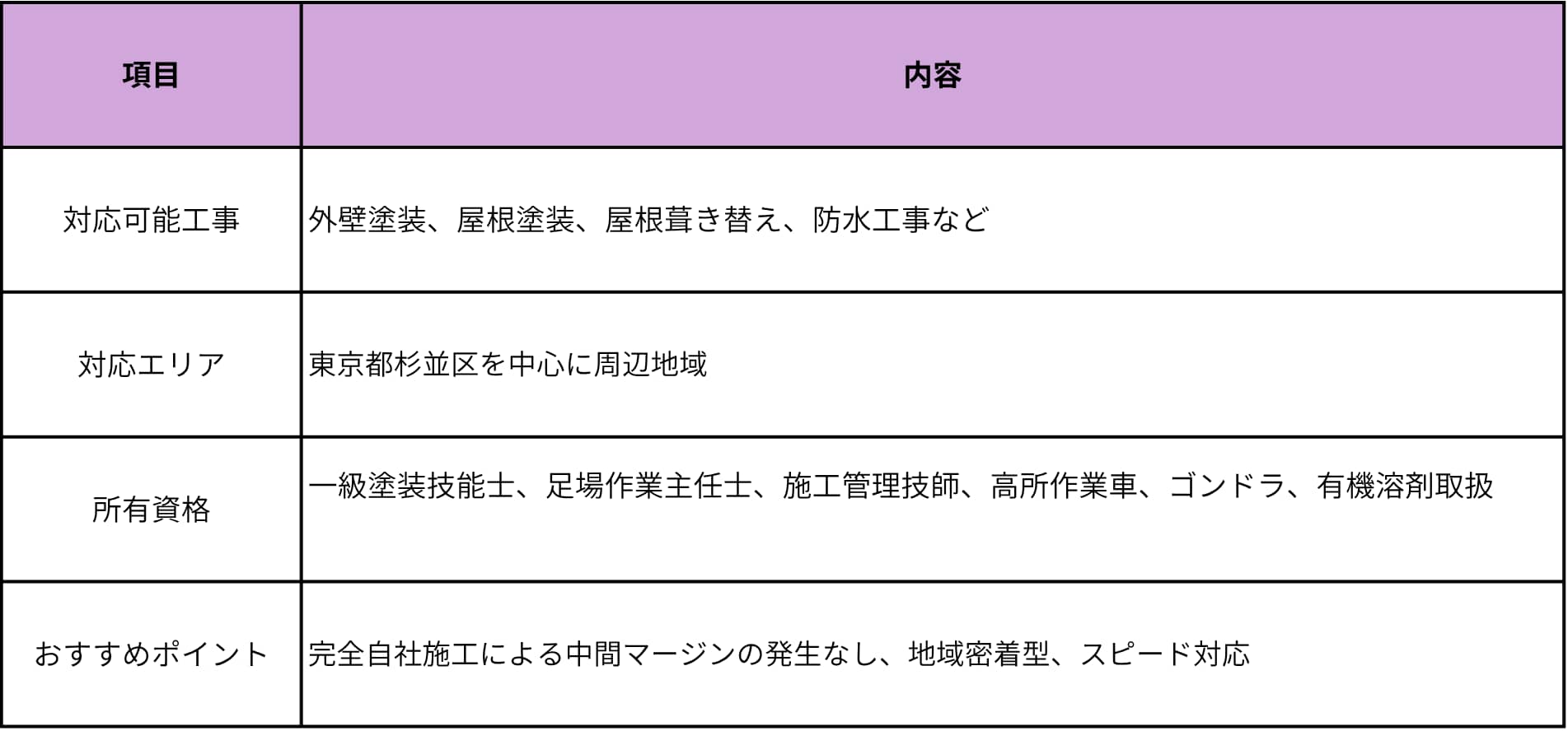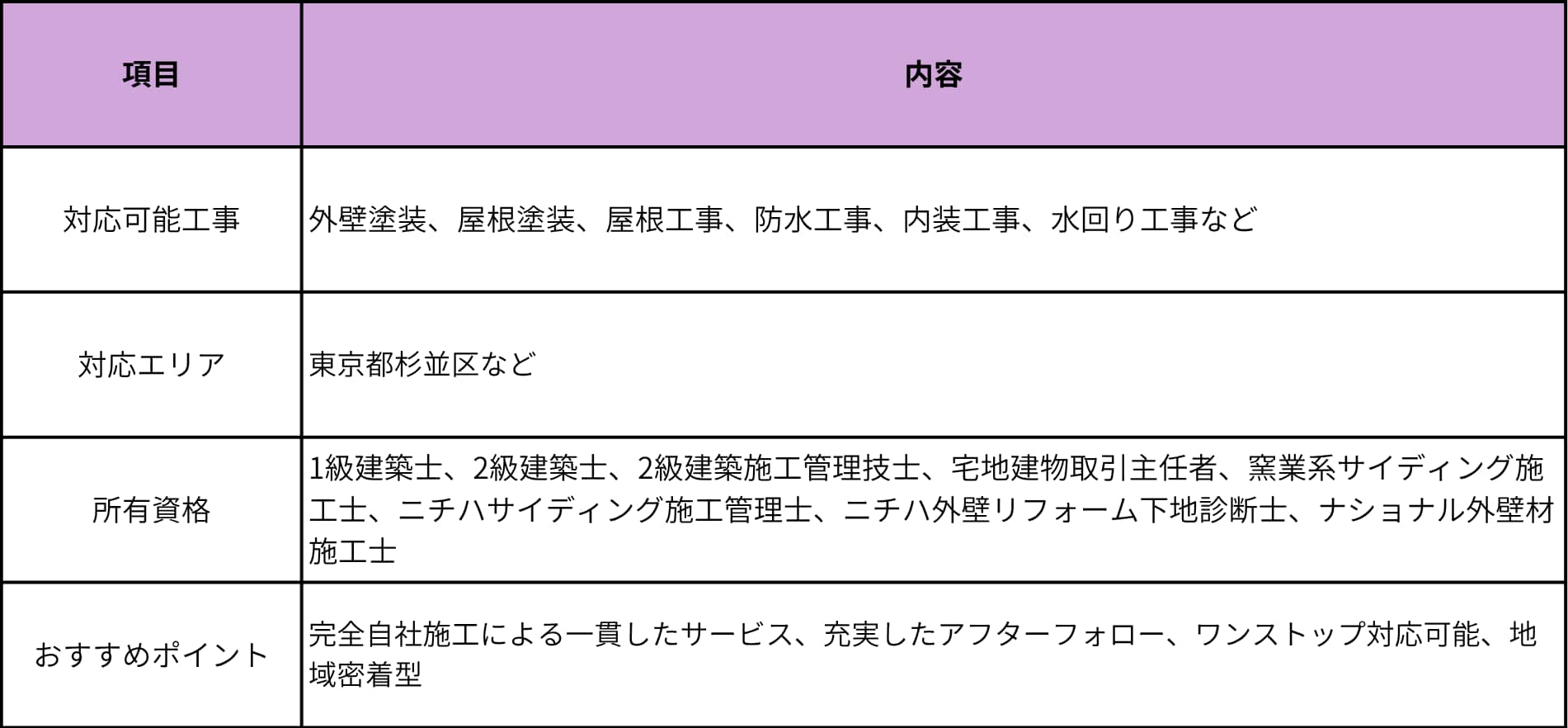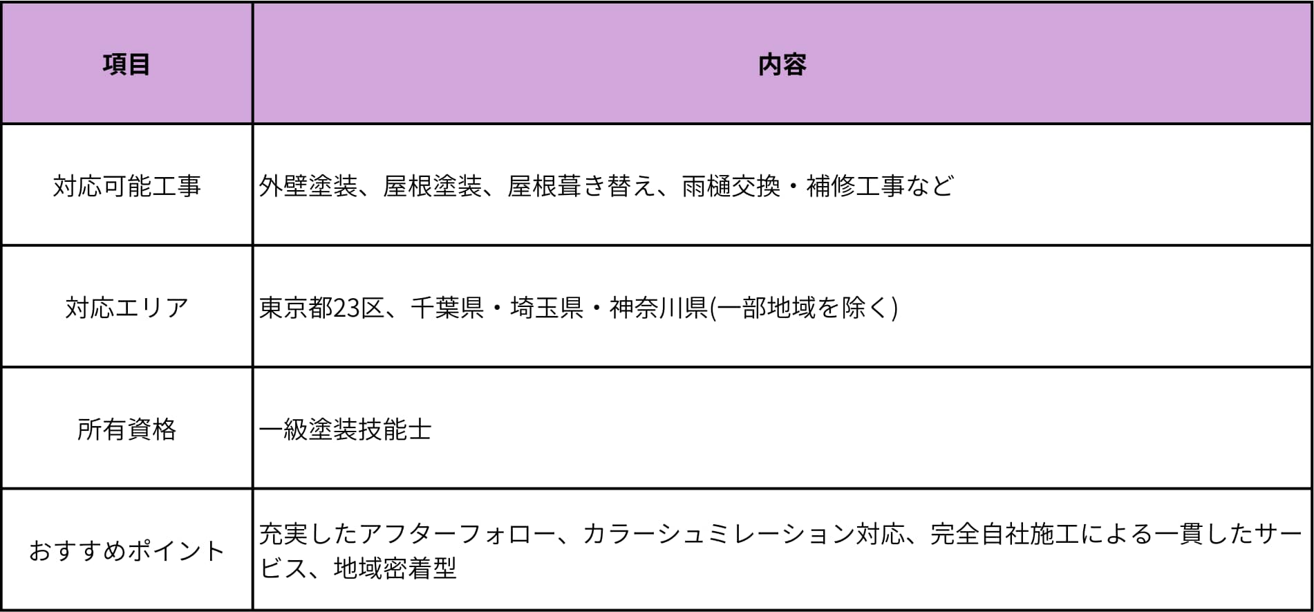 屋根・外壁・防水・吹付・シーリング工事を一連でワンストップで請け負う責任施工体制を採っており、設計・内装・外装・リフォーム・エクステリア工事までトータルで対応可能です。「責任と安心を第一優先」に掲げ、お客様の信頼を基盤とした外壁塗装サービスを提供し、住まいの美観と耐久性を長年にわたり支えるパートナーです。