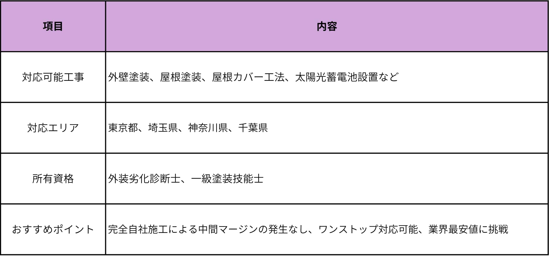 さらに、外壁塗装にとどまらず、屋根工事・屋根塗装、内装・外構リフォーム、太陽光発電・蓄電池設置など、住まいを総合的に支えるサービス展開も行っております。最後まで安心と満足を届けてくれる、信頼できるパートナー企業です。